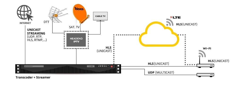 O equipamento pode se comportar como um transcodificador (para converter os canais nos requisitos de saída) ou um streamer (para atender conteúdos já transcodificados pelo HLS) em arquiteturas complexas, ou incluem ambas as funcionalidades, exercendo o modo de operação autónomo em que um único dispositivo permite tudo o que é necessário para poder desfrutar de canais de TV em dispositivos móveis através de redes Wi-Fi.