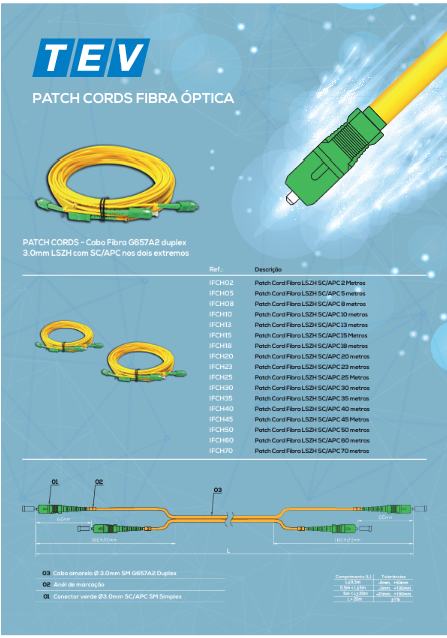 A TEV apresenta a gama mais completa de Patch Cords IFCH em fibra G657A2 duplex 3.0mm LSZH agora até 70 metros, desenvolvidos para responder às exigências das instalações ITED.